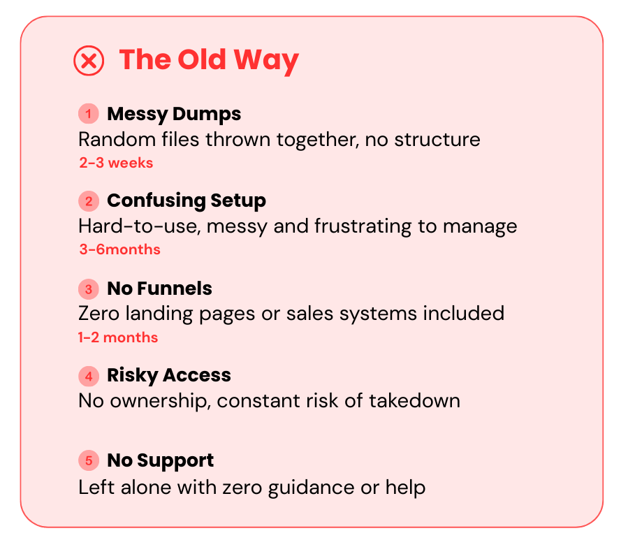 Two years wasted building from scratch while others start instantly with plug-and-play systems.
